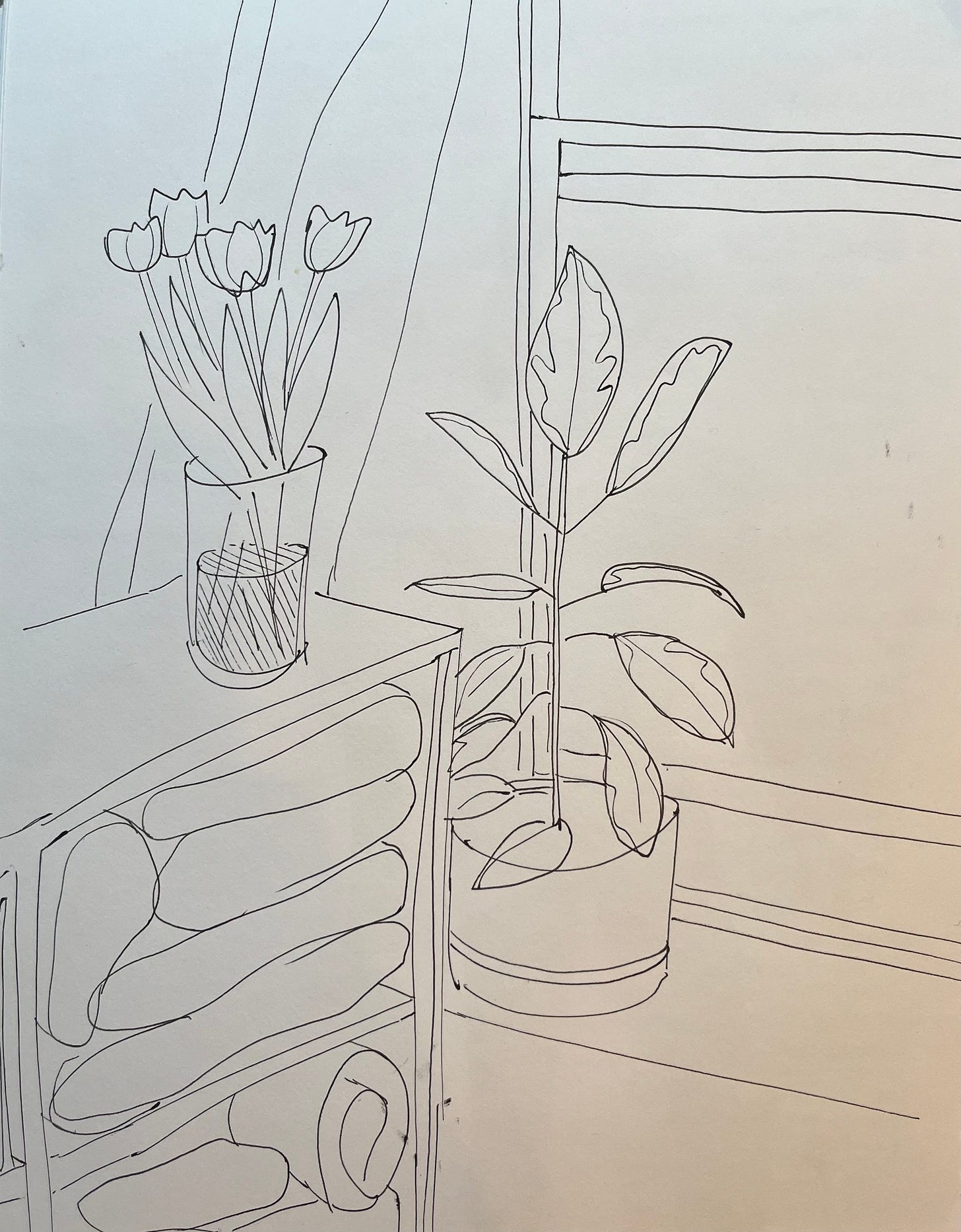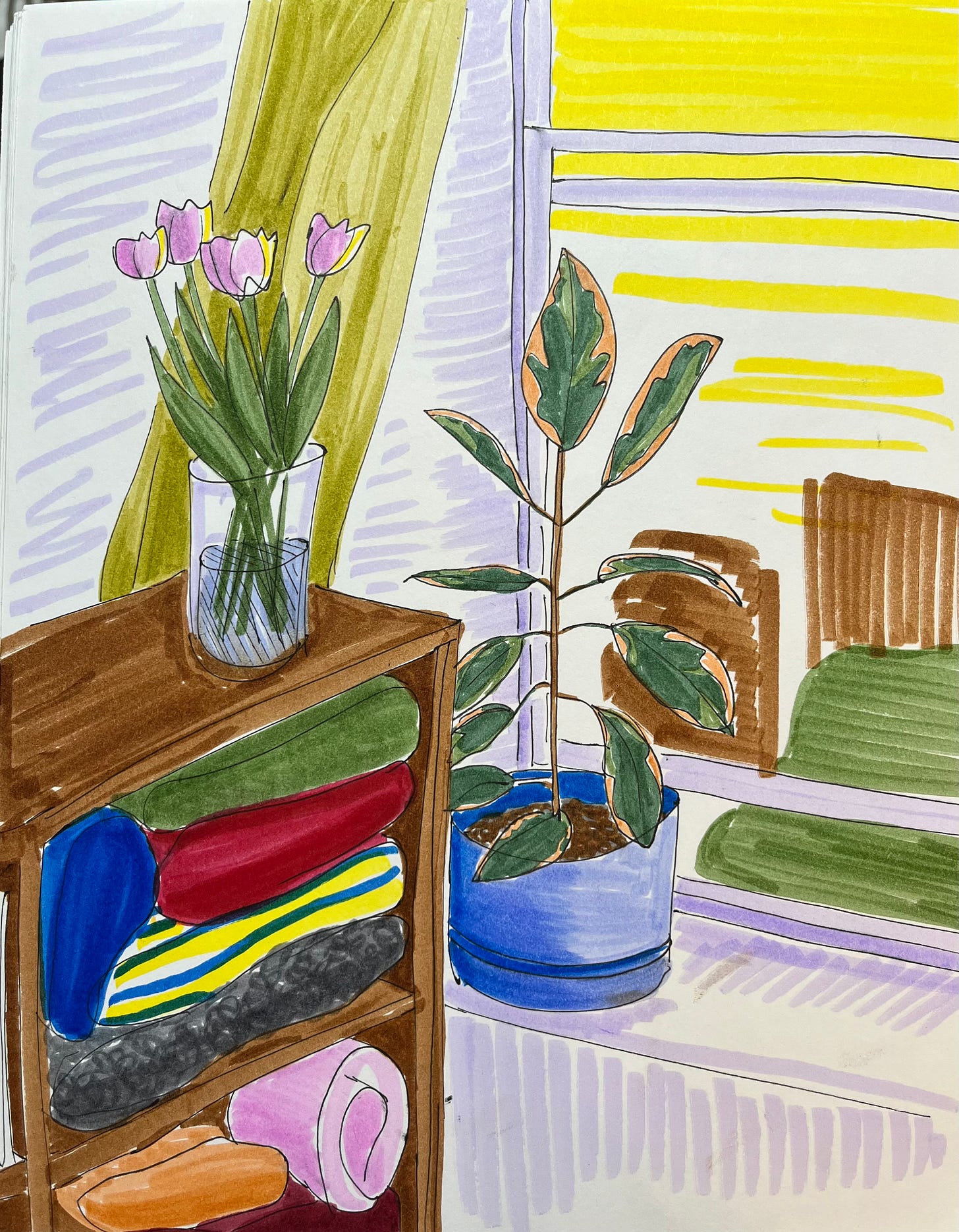 I added color to the drawing from day 50 and I regret attempting to add details to the scene outside the window. Oh well! The rubber tree plant, flowers, shelf, and windowsill turned out nice I think. I love my markers. :)